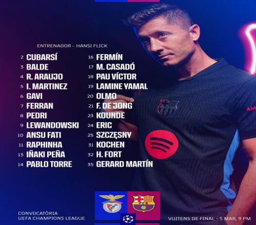 巴萨欧冠客战本菲卡名单:莱万、亚马尔、加维、奥尔莫在列