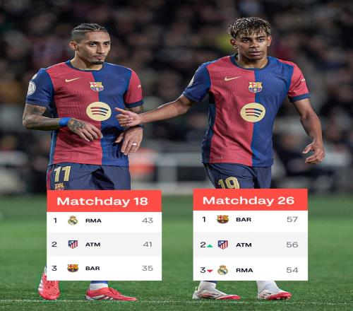 扭转局势!ESPN晒照:18轮后巴萨落后皇马8分,第26轮后巴萨领跑