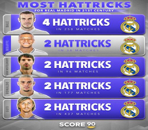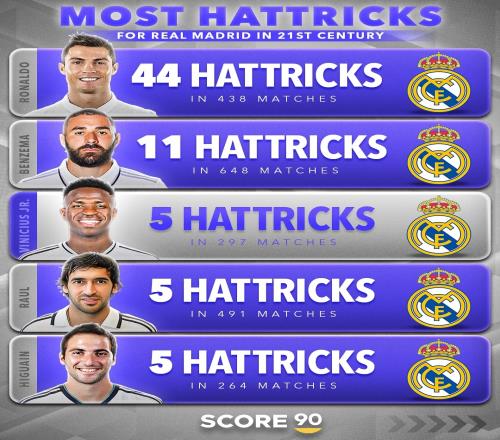 21世纪皇马球员戴帽次数TOP10C罗44次断层领先姆巴佩2次上榜