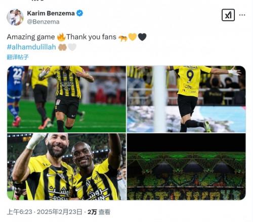 本泽马社媒晒出比赛照片庆祝胜利,配文:“精彩的比赛,感谢球迷们。”