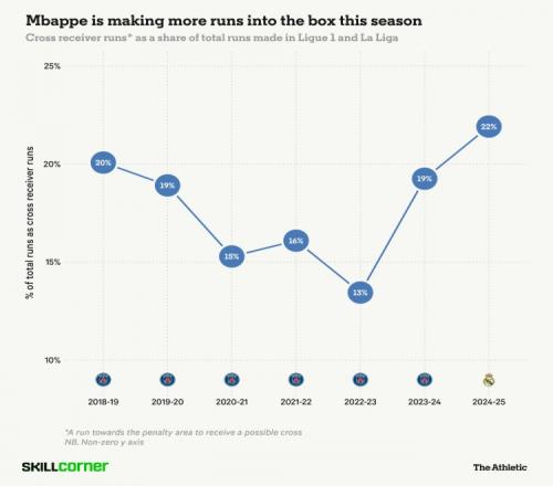 本赛季,姆巴佩更多地进入禁区进行跑位