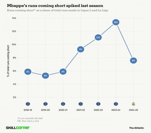 尽管速度是姆巴佩引以为傲的武器,但似乎学会“减速”的姆巴佩已然变得更具战斗力。同时,因更合理利用速度而带来的角色转变,似乎正不可避免的在姆巴佩身上发生。The Athletic作者Tom Williams和Mark Carey就讨论了这一话题。