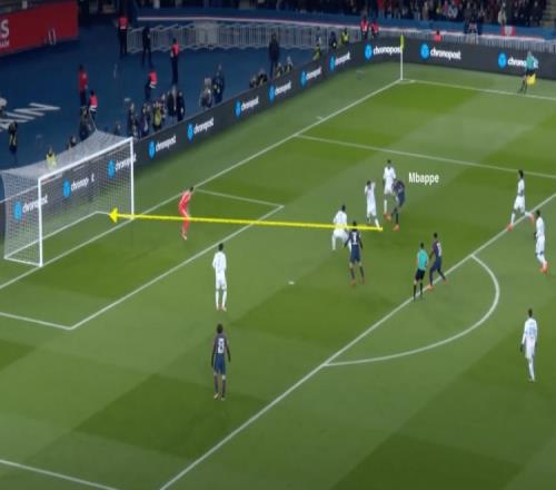 当罗德里戈从右路带球内切之时,姆巴佩背对着球门,以便更好地创造进攻空间……
