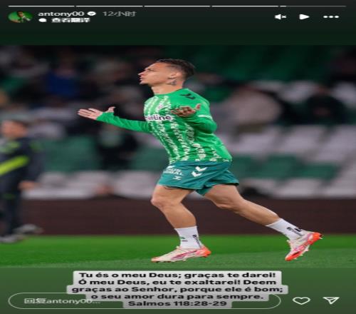 安东尼在社交媒体上晒出身穿贝蒂斯训练服照片,并引用圣经诗篇第118章部分内容:“你是我的神,我要称谢你!你是我的神,我要尊崇你!你们要称谢耶和华,因他本为善;他的慈爱永远长存。”