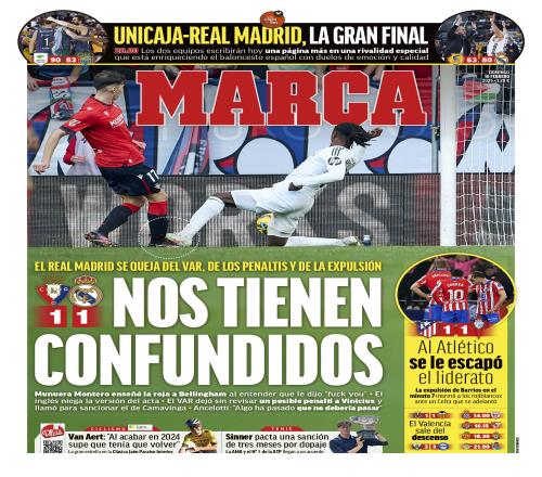 马卡报头版聚焦皇马vs奥萨苏纳争议判罚:令我们困惑