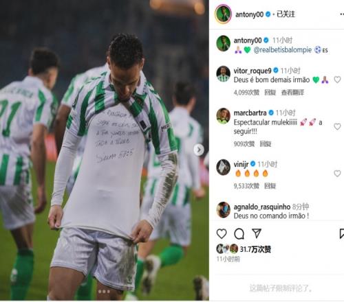 赛后,安东尼更新社媒庆祝自己取得进球和球队获胜:“