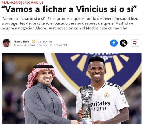 据悉,沙特方面的报价仍未正式发出,目前唯一摆在台面上的就是他们的承诺,沙特人表示他们会在今夏为维尼修斯向开出一份约3亿欧元的巨额报价,并且坚称“无论如何我们会签下他”(“Le ficharemos sí o sí”)。