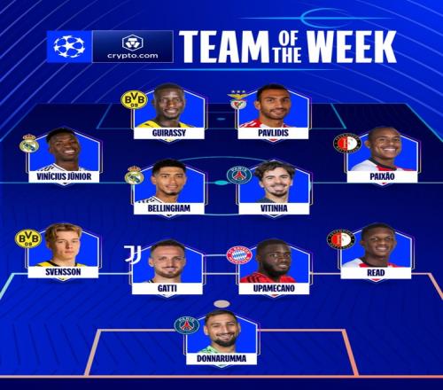 本周欧冠最佳阵:维尼修斯、贝林厄姆、于帕梅卡诺、多纳鲁马在列