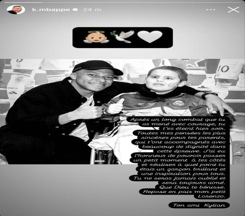 体育资讯02月13日报道宣称 在今年1月份,姆巴佩曾邀请了一位身患绝症的小球迷来到伯纳乌观赛,而这名小球迷于昨日不幸离世,姆巴佩也在社媒悼念。
