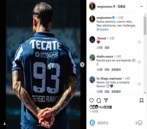 拉莫斯社媒晒出身穿蒙特雷93号球衣的背影照片,配文:“新的冒险,新的挑战。”