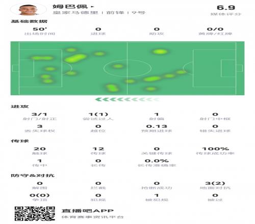 体育资讯2月12日报道宣称 欧冠淘汰赛附加赛首回合,曼城主场半场1-0领先皇马。姆巴佩半场重点数据如下↓