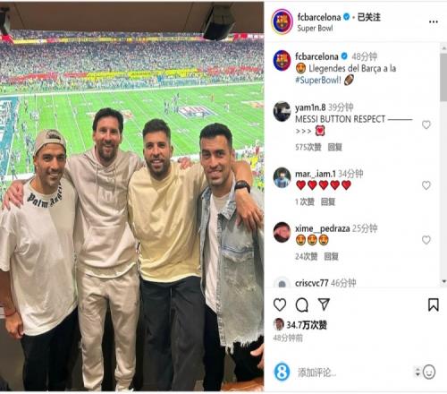 梅西、苏亚雷斯、阿尔巴、布斯克茨一起观看了比赛,巴萨社媒晒出四人的合照,配文:“巴萨传奇在超级碗。”