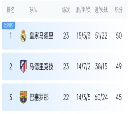 巴萨第23轮对阵塞维利亚的比赛还没踢,目前落后第二的马竞4分,落后榜首的皇马5分。
