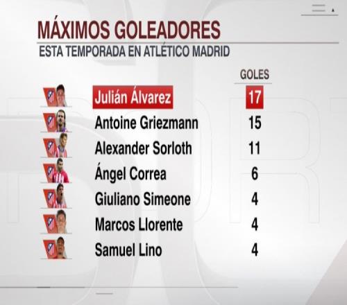 本赛季马竞射手榜:阿尔瓦雷斯17球居首,格列兹曼15球次席