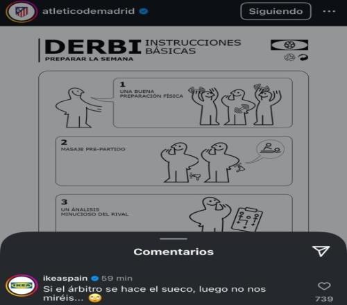 马竞在社交媒体上发布了一份模仿宜家家具安装说明书的"德比赛前准备基本说明",其中包含四个步骤:体能准备、赛前按摩、分析对手,以及讽刺皇马“使用官方电视台对裁判施压”。