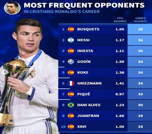 西甲故人!C罗生涯对手交锋榜:布斯克茨38次,梅西&伊涅斯塔36次