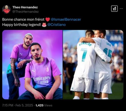 体育资讯2月5日报道宣称 今天是C罗40岁的生日,特奥也向他送上了生日祝福,同时还告别了离开米兰加盟马赛的本纳塞尔。