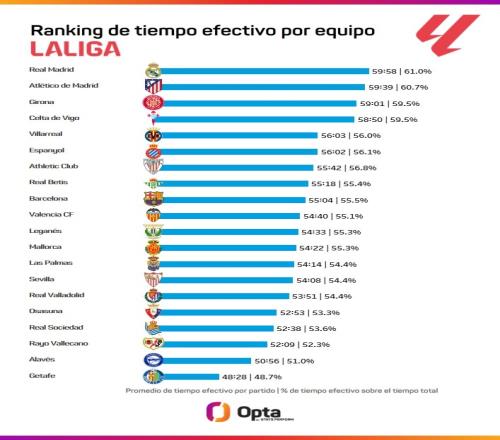 体育资讯2月4日报道宣称 数据结构OPTA统计了本赛季西甲场均净比赛时间,皇马力压马竞居首。