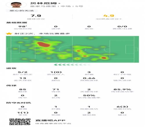 贝林厄姆本场数据:5射2正,2次关键传球,预期进球0.66,评分7.9