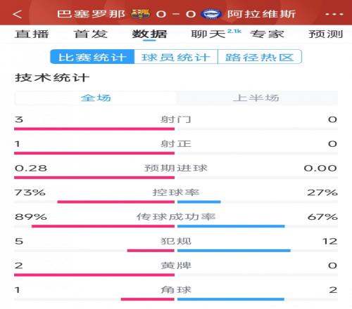 沉闷,巴萨vs阿拉维斯半场数据:射门30,射正10,犯规512