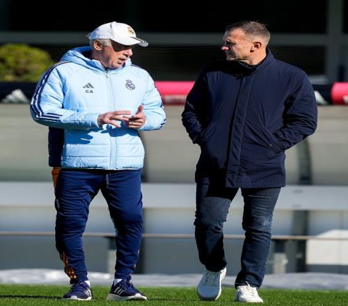 米兰名宿舍甫琴科今天到皇马训练基地探班,皇马官推晒出了他与恩师安切洛蒂聊天的照片。