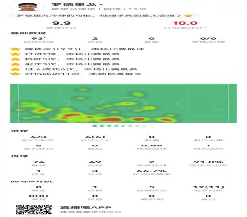 罗德里戈数据:2粒进球,6次过人全成功,11次成功对抗,评分9.9