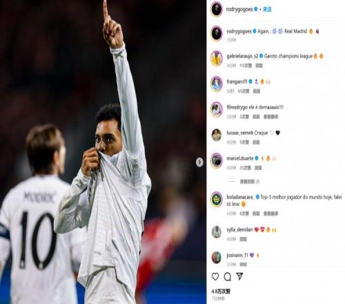 罗德里戈也在赛后通过社媒晒出自己的庆祝照,并配文:“又一次……⚽️⚽️ 皇家马德里