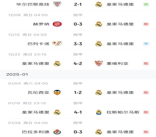 皇马联赛四连胜、近6场不败,4分优势领跑。