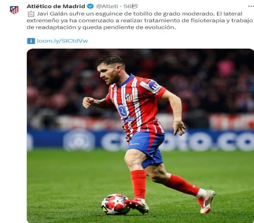 马竞官方表示,检查结果确认,加兰的脚踝中度扭伤,他已经开始接受理疗,并进行康复工作,何时复出将取决于伤势恢复进展。