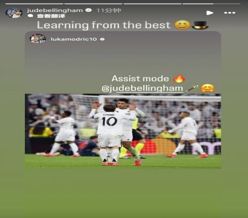 本场比赛贝林厄姆两次送出助攻,莫德里奇下半场也助攻维尼修斯破门。赛后莫德里奇在社媒晒出与贝林厄姆的合照,配文称赞道:“贝林厄姆开启助攻模式!”后者则回应道:“向最佳学习!”