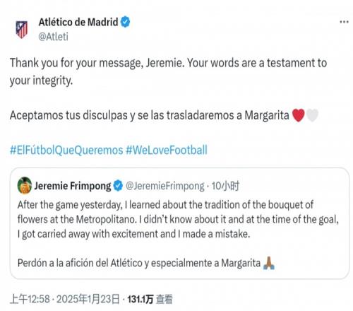 马竞官方转发了弗林蓬的社媒动态,回复道:“感谢你的留言,杰里米。你的话语证明了你的正直。我们接受你的道歉,将把你的歉意传达给玛格丽塔。”