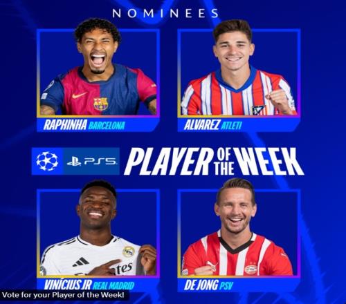 欧冠官方本轮最佳球员候选:拉菲尼亚、维尼修斯、小蜘蛛、德容