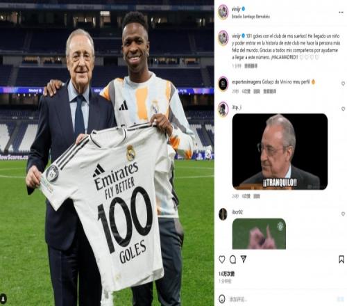 维尼修斯也达成了皇马生涯各项赛事100球里程碑,赛后球队主席弗洛伦蒂诺也赠与他100球纪念球衣,维尼修斯在社媒晒出这张照片,配文写道:“为我梦寐以求的球队打进101粒进球,我从很小就来到这里,能够成为皇马历史的一部分让我成为这世界上最幸福的人。感谢所有帮助我达成这一里程碑的队友。HALA MADRID!”