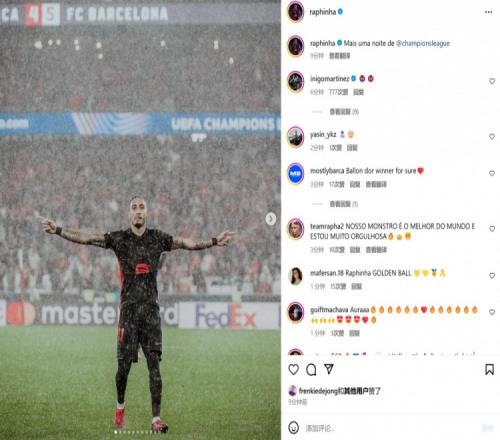 读秒绝杀大逆转,拉菲尼亚社媒晒庆祝照:又一个欧冠之夜!
