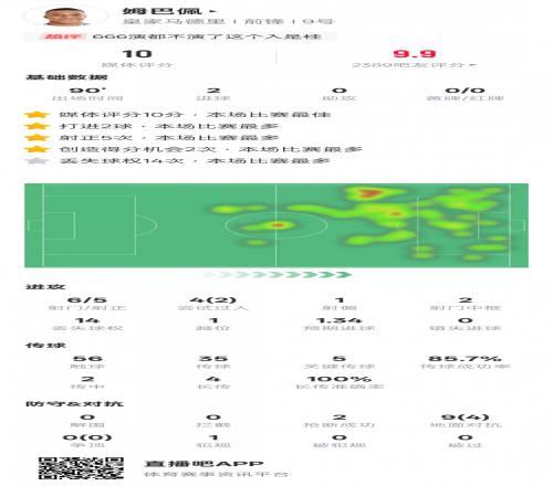 姆巴佩本场比赛数据如下: