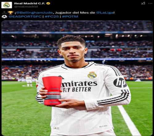 在12月份的5场西甲联赛中,贝林厄姆打进4球并有2次助攻,当选西甲官方评选出的月最佳球员。