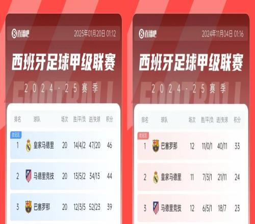 随后3队各赛8场,形势发生大逆转。马竞这8场拿到21分仅丢3分,20轮积44分;皇马这9场(补赛一场)拿到22分,2分优势登顶领跑;巴萨这8场仅得6分,打到第20轮落后马竞5分、落后皇马7分。