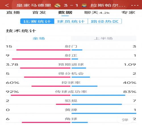体育资讯1月20日报道宣称 本轮西甲皇马对阵拉斯帕尔马斯上半场结束,皇马3-1逆转取得领先。以下为双方半场数据: