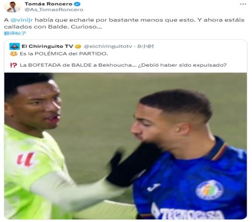 补时阶段,巴尔德离谱传中后被赫塔费球员别克胡查贴脸嘲讽,巴尔德拍脸,后者顺势倒地。主裁判并未对巴尔德出牌,只黄牌警告了两队的主教练。