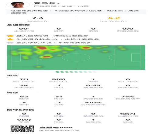 亚马尔本场数据:6次过人成功&24次丢失球权均全场最多,评分7.3
