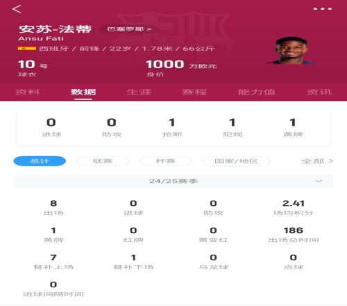 法蒂本赛季只为巴萨出场了8次,其中1次首发,共计186分钟,0球0助。