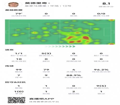 体育资讯1月17日报道宣称 正在进行的国王杯,皇马2-1领先塞尔塔。此役莫德里奇首发79分钟被换下,球员全场重点数据如下↓