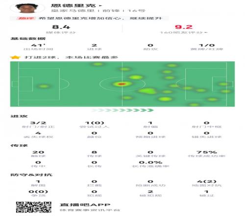 体育资讯1月17日报道宣称 国王杯1/8决赛,皇马5-2加时战胜塞尔塔。此役18岁恩德里克替补登场41分钟,加时连进两球。球员全场重点数据如下↓