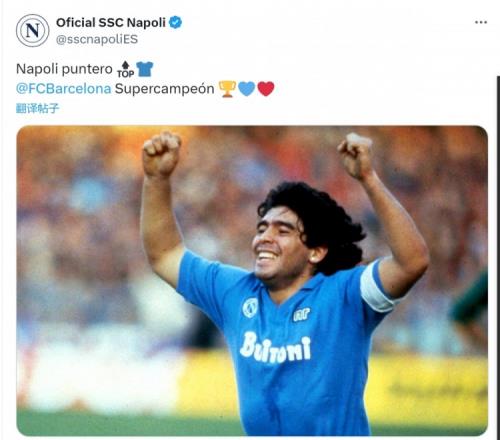 那不勒斯和巴萨都是马拉多纳的老东家,那不勒斯西语官方社媒晒出马拉多纳的照片,并配文:“那不勒斯(意甲)领头羊,巴萨西超杯冠军。”