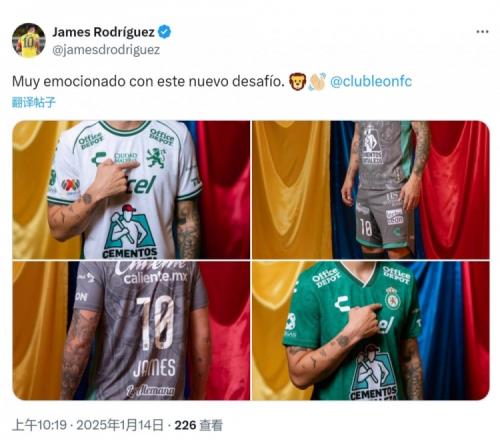 J罗在社交媒体上晒出自己身穿莱昂10号球衣的照片,配文:“很兴奋迎来这个新挑战。”