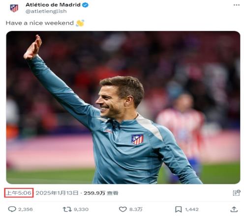 皇马在西超杯决赛2-5惨败巴萨,赛后第一时间,马竞官推晒出AZP挥手照:“周末愉快