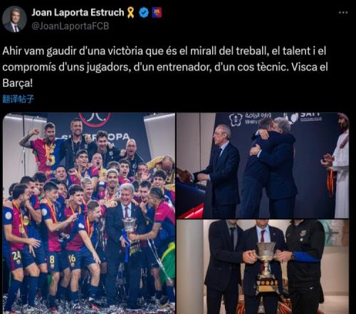 体育资讯1月13日报道宣称 西超杯决赛,巴萨5-2击败皇马夺得冠军。巴萨主席拉波尔塔更新社媒,庆祝赢球。