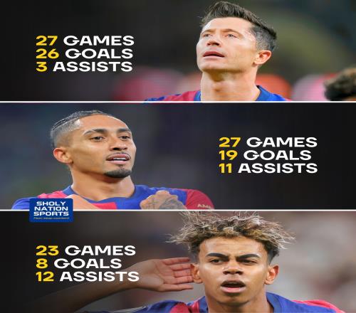 据统计,莱万目前27场26球3助,拉菲尼亚27场19球11助,亚马尔23场8球12助。
