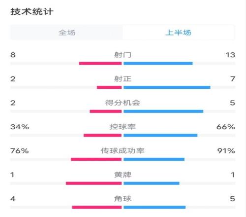 皇马半场14巴萨数据:射门813,射正27,控球率34%66%