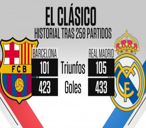 据ESPN统计,皇马与巴萨此前曾交手258次,皇马取胜105场,打进433球,巴萨取胜101场,打进423球。